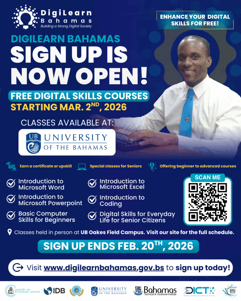 The DigiLearn Bahamas program, delivered in partnership with the University of The Bahamas (UB) and the Bahamas Technical and Vocational Institute (BTVI), offers free digital skills courses tailored to up-skill different demographics and learning needs. Participants will receive certificates of completion from UB and credentials from BTVI (specified courses) upon successfully finishing courses.